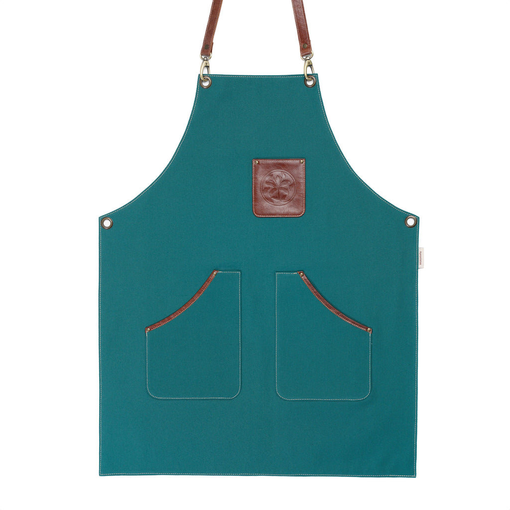 Stand out in the kitchen or studio with this eye-catching teal canvas apron. Designed with durable leather accents and pockets, this apron combines a bold color with practicality. Perfect for chefs, artists, and craftsmen, it offers both style and utility, making it ideal for various professional and hobbyist settings.